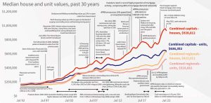 Historically, property values have grown over time, despite occasional dips. In 2022, CoreLogic assembled a report that included the median house and unit values over the 30 years prior. As the graph below illustrates, the overall trend has been upward, despite some periods of slower or no growth.