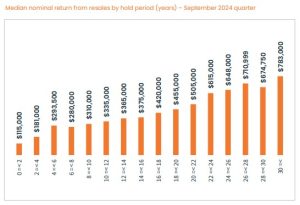 These cycles are influenced by various things including macroeconomic factors like interest rates, economic growth and consumer confidence. Take, for example, the data from the September 2024 quarter in CoreLogic’s Pain & Gain report. As the table below illustrates, the median profit made on resales increases consistently the longer a property is held.